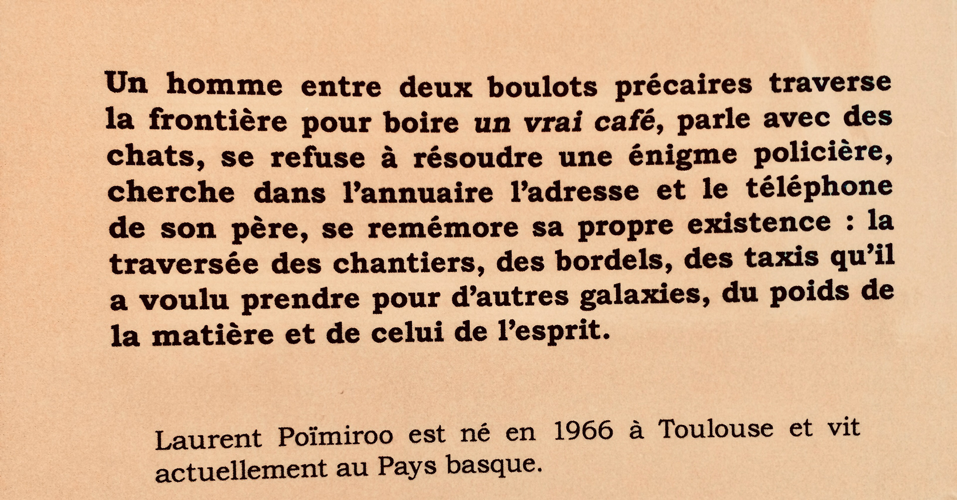 Poïmiroo en ancien béarnais ça veut dire "le point de vue ou le haut du puits" d’après l’Académie du Béarn, "peut-être même une très ancienne étymologie de poëte" (sic). Laurent Poïmiroo est né en 1966 à Toulouse, rue des bûchers - sans doute là même où 800 ans plus tôt on avait cru bon de carboniser les Cathares du coin- d’un père élève officier mécanicien de la marine marchande et d’une mère styliste de mode stagiaire chez Dior. L’enfant est élevé les cinq premières années par son arrière-grand mère, Maria Aïn (en langues sémites aïn veut dire à la fois la source et l’orifice d’où coulent les larmes) née en 1896 cinq ans après l’ultime voyage d’Arthur Rimbaud à Marseille.